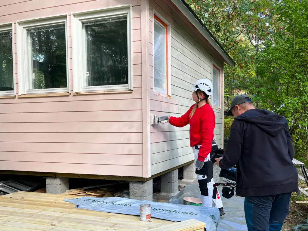 Mökki päätetään uusia kokonaan. Sorcolorin maalari maalasi mökin kauniin vaaleanpunaiseksi. Maalipinta kestää hyvin seuraavat 10-15 vuotta.