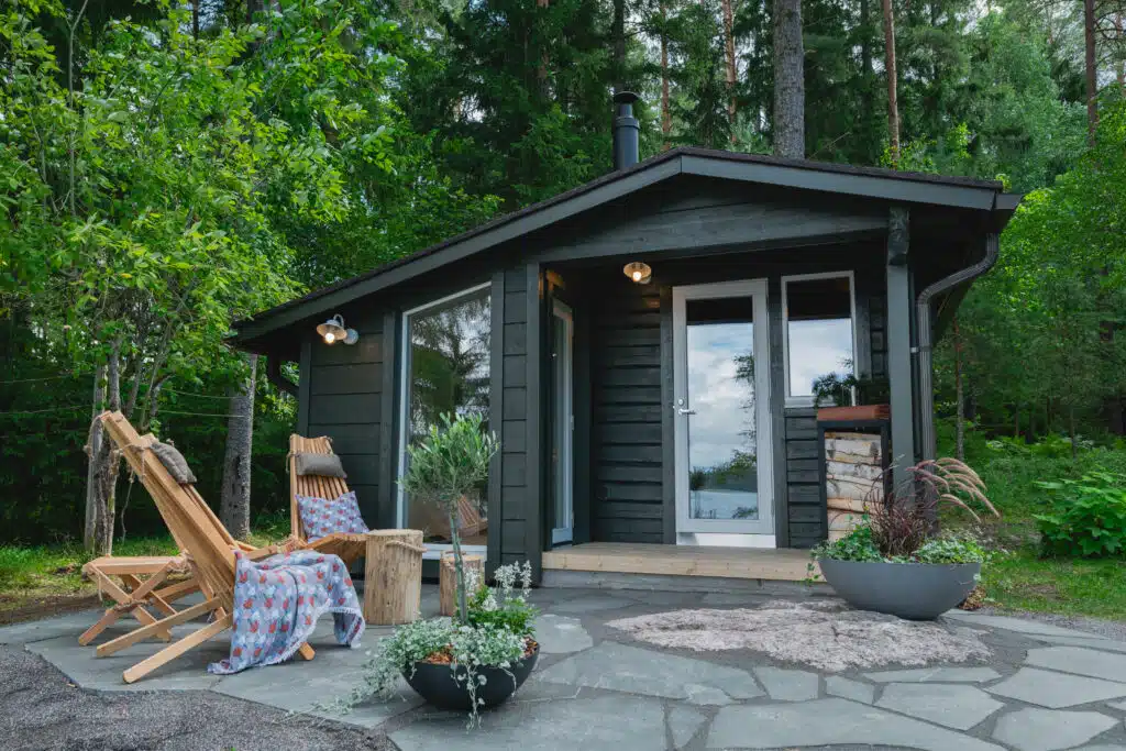 Sorcolorin maalarit olivat maalaamassa myös tätä kohdetta. Saunamökin ulkoverhouksen väriksi valittiin tummanvihreä sävy, joka sopii hyvin ympäröivään luontoon.