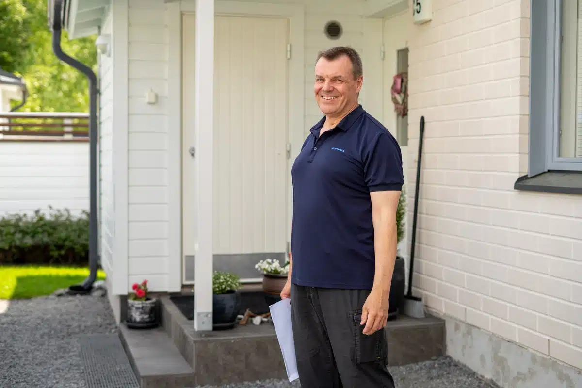 Mies seisoo asuntonta edustalla hymyille leveästi.