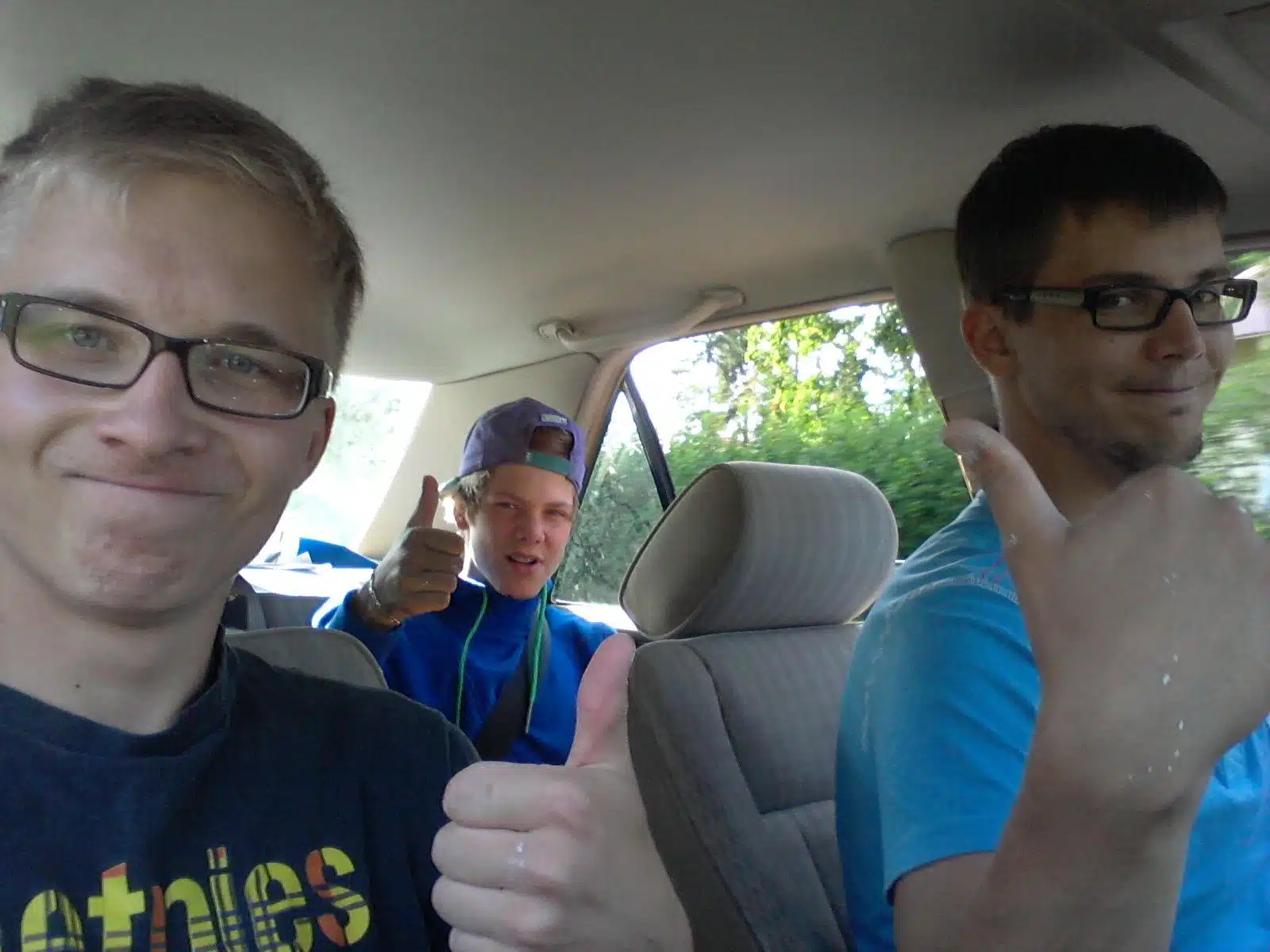 Kuvassa kolme nuorta miestä autossa näyttää peukkua.