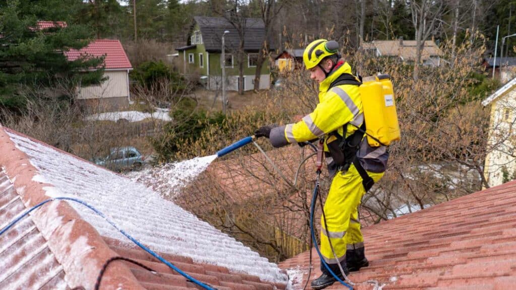 Sammaleenestoaine ruiskutetaan pesuriin liitettävästä säiliöstä puhtaalle juuri pestylle katolle. Aine varmistaa, että sammalta ei pääse puskemaan päälle laitettavan maalipinnan alta.