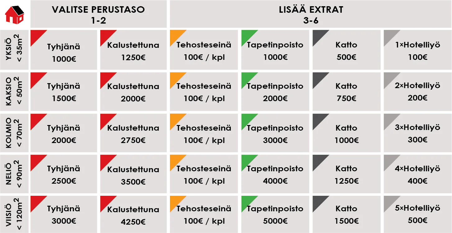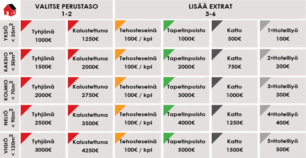 Asunnon maalauksen hinnat alla olevassa taulukossa.